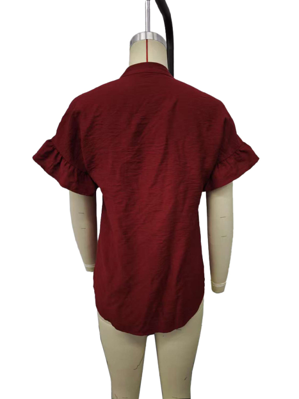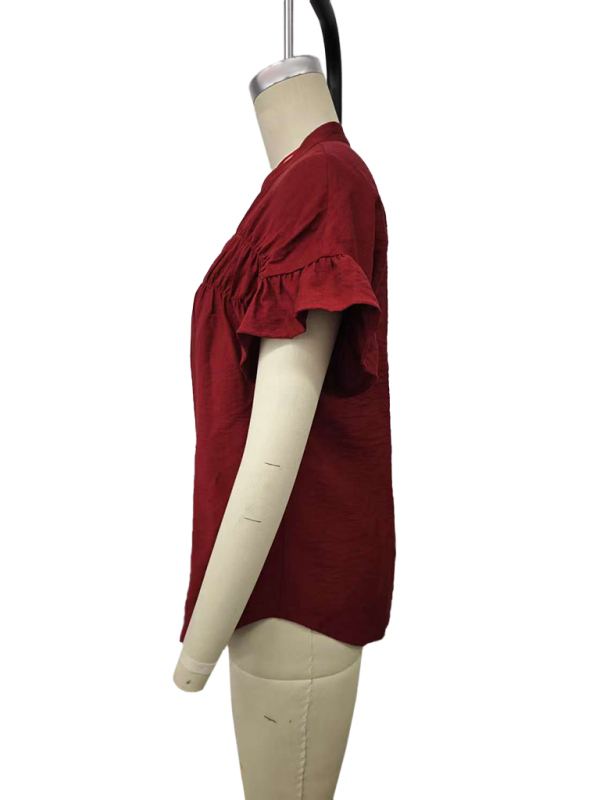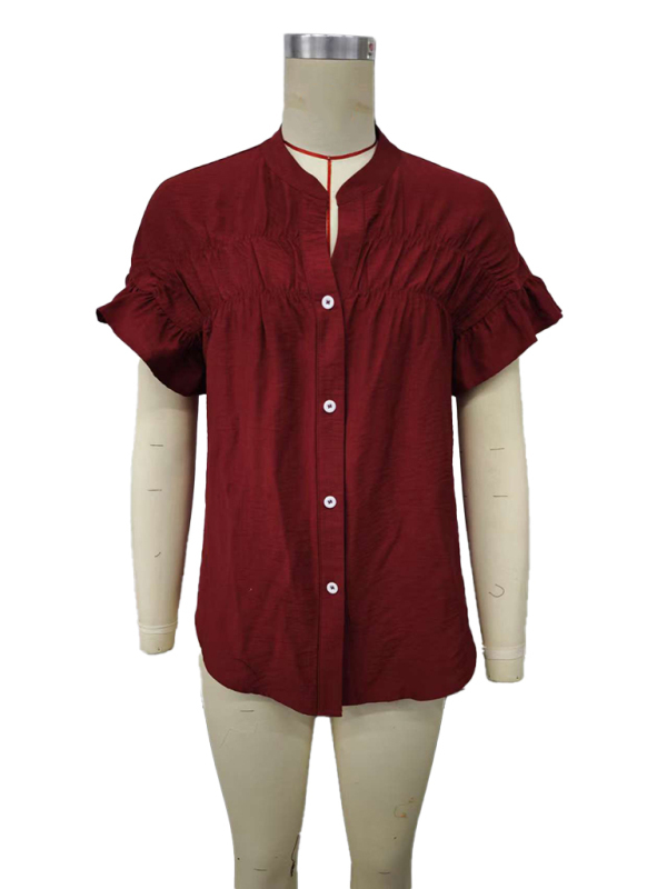 Casual short-sleeved gathered shirt solid color stand collar shirt