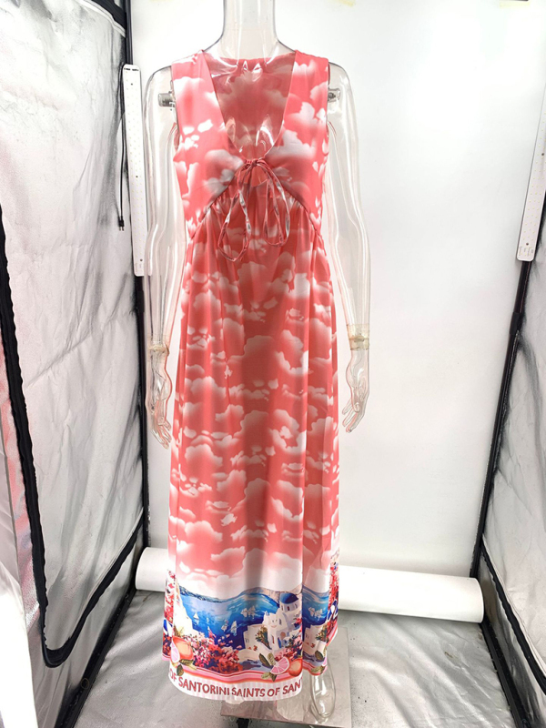 Linen Printed Casual Sleeveless V-Neck Maxi Dress