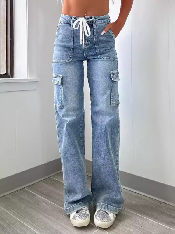 New Casual Lace-Up Multi-Pocket Functional Workwear Straight Leg Jeans