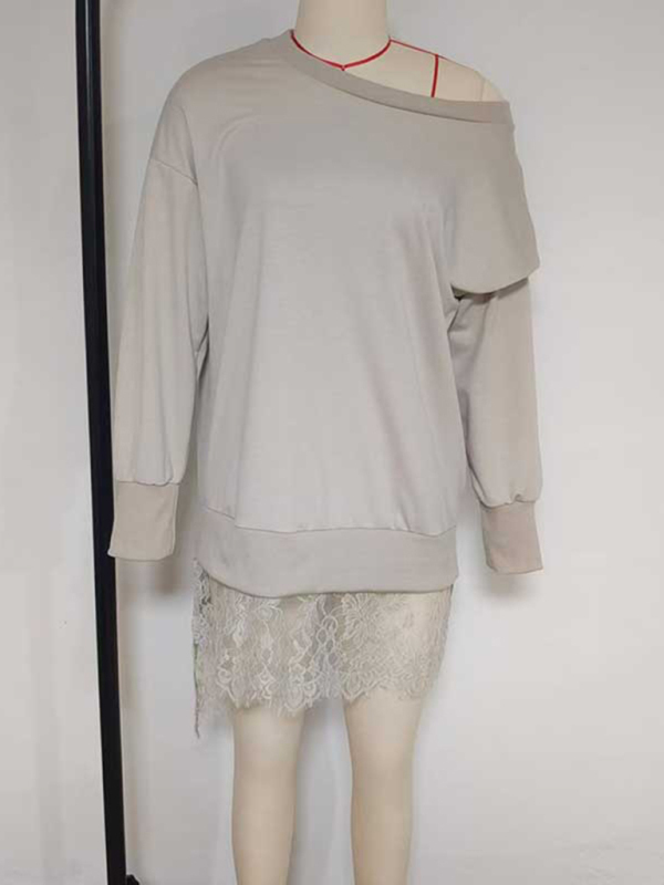 New Fashion Lace Slit Mid-Length Casual Loose Pullover Sweater
