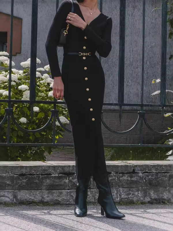 New Long Sleeve Knitted Dress Button Slit Hip Sweater Cardigan Dress