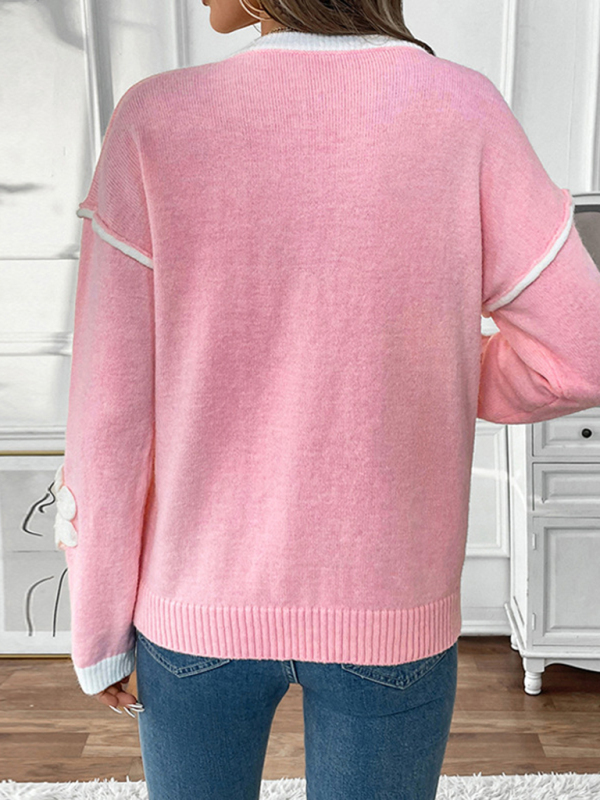 Valentine's Day long-sleeved V-neck 3D applique pink sweater